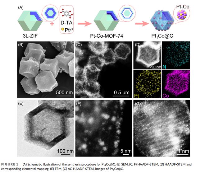 Pt₁Co@C 为中空十二面体结构,BET 比表面积达 615.4 m²/g,孔径分布 0.5-60 nm,缺陷丰富(I_D/I_G=1.2)。 Pt 以单原子形式均匀分散于 Co 纳米颗粒晶格中,Pt 含量为 1.68 wt%,形成 Pt₁Co 单原子合金;将 Pt 单原子引入 Co 纳米颗粒中导致电子重分布,在形成的 Pt₁Co@C 中产生缺电子的 Pt 单原子位点。